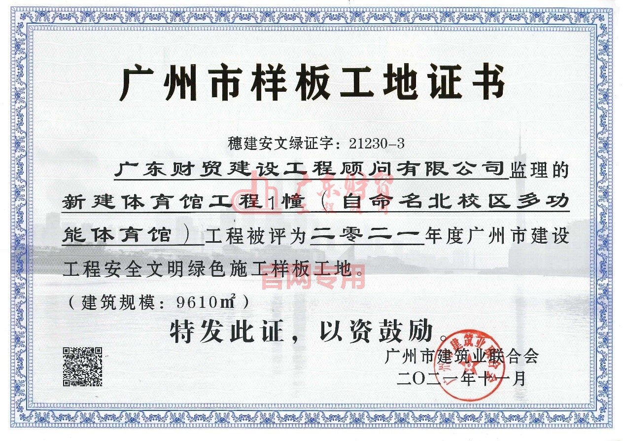 五、新建体育馆工程1幢(北校区多功能体育馆)荣获2021年度广州市建设工程安全文明绿色施工样板工地