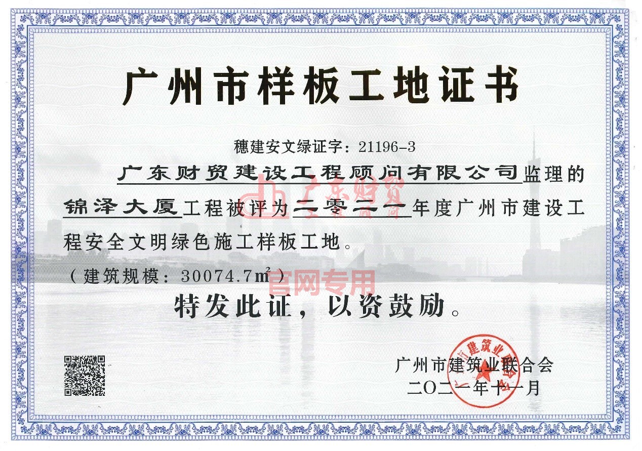 三、锦泽大厦工程荣获2021年度广州市建设工程安全文明绿色施工样板工地