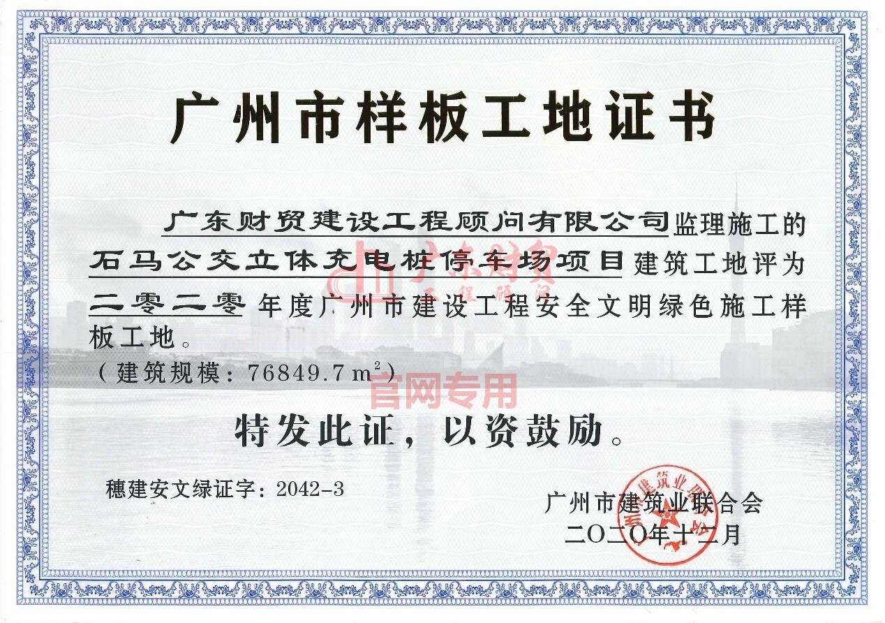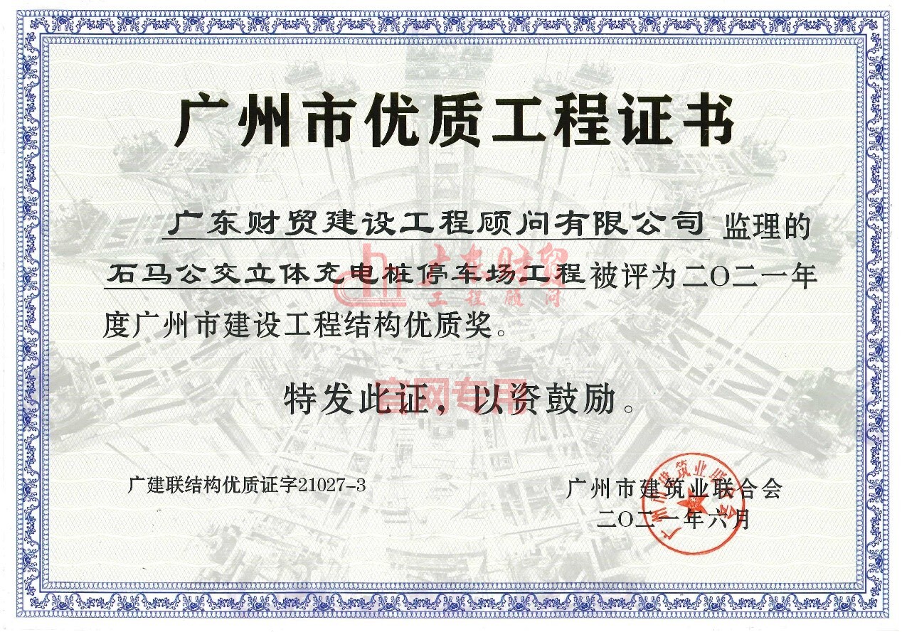 四、石马公交立体充电桩停车场项目荣获2020年度广州市建设工程安全文明绿色施工样板工地、2021年度广州市建设工程结构优质奖