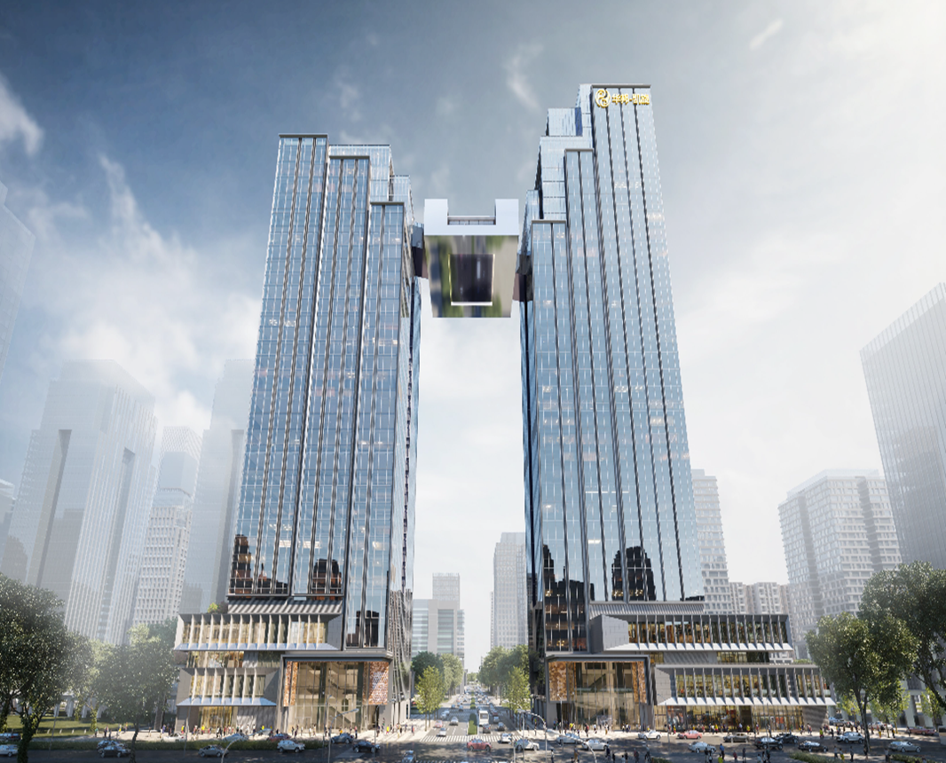 该项目最大的特色,在于被称为“空中客厅”的百米空中钢结构连廊。本项目在A塔楼26-27层与B塔楼29-30层之间设置单层钢结构连廊,连廊高8.55m,南北最大跨度22.8m,东西最大跨度46.28m,总重约1000吨。项目采用整体液压同步提升技术与地下室顶板回顶技术进行安装,在地面拼装后整体液压同步提升到134.5m处的高空进行连接,对安全性要求极高。