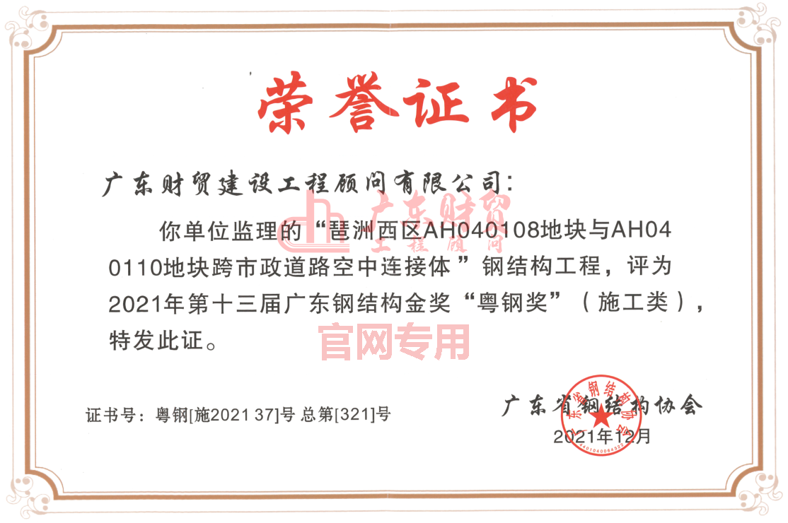 近日,第十三届广东钢结构金奖“粤钢奖”宣布获奖名单,广东财贸建设工程顾问有限公司承接的华邦控股集团琶洲项目AH040108、AH040110地块工程被评为“粤钢奖”(施工类),我司周志来、谢连雪等8名人员荣获“优秀技术人员”称号。