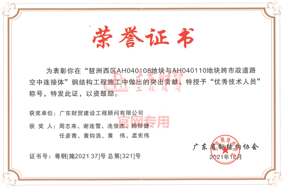 【概要描述】近日,第十三届广东钢结构金奖“粤钢奖”宣布获奖名单,广东财贸建设工程顾问有限公司承接的华邦控股集团琶洲项目AH040108、AH040110地块工程被评为“粤钢奖”(施工类),我司周志来、谢连雪等8名人员荣获“优秀技术人员”称号。