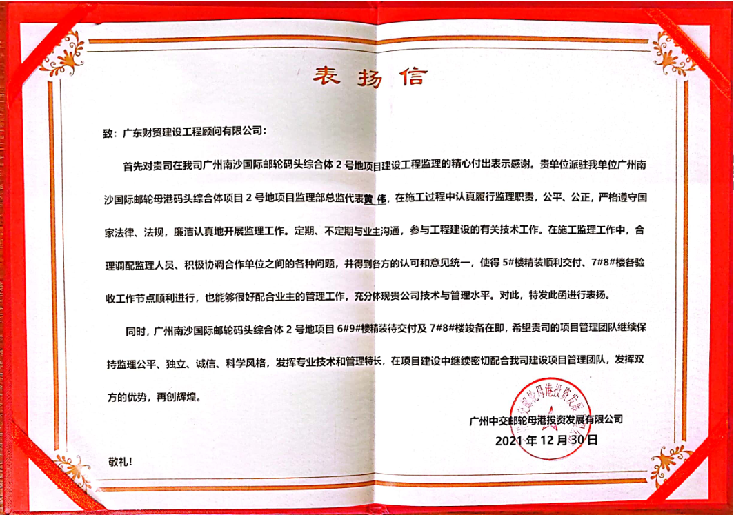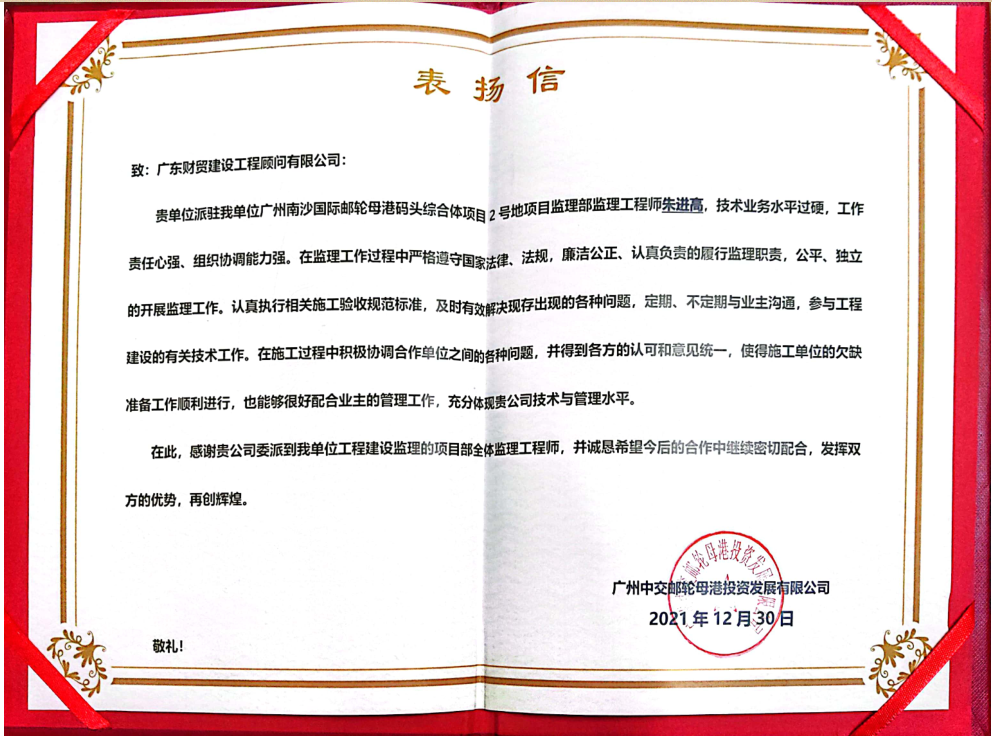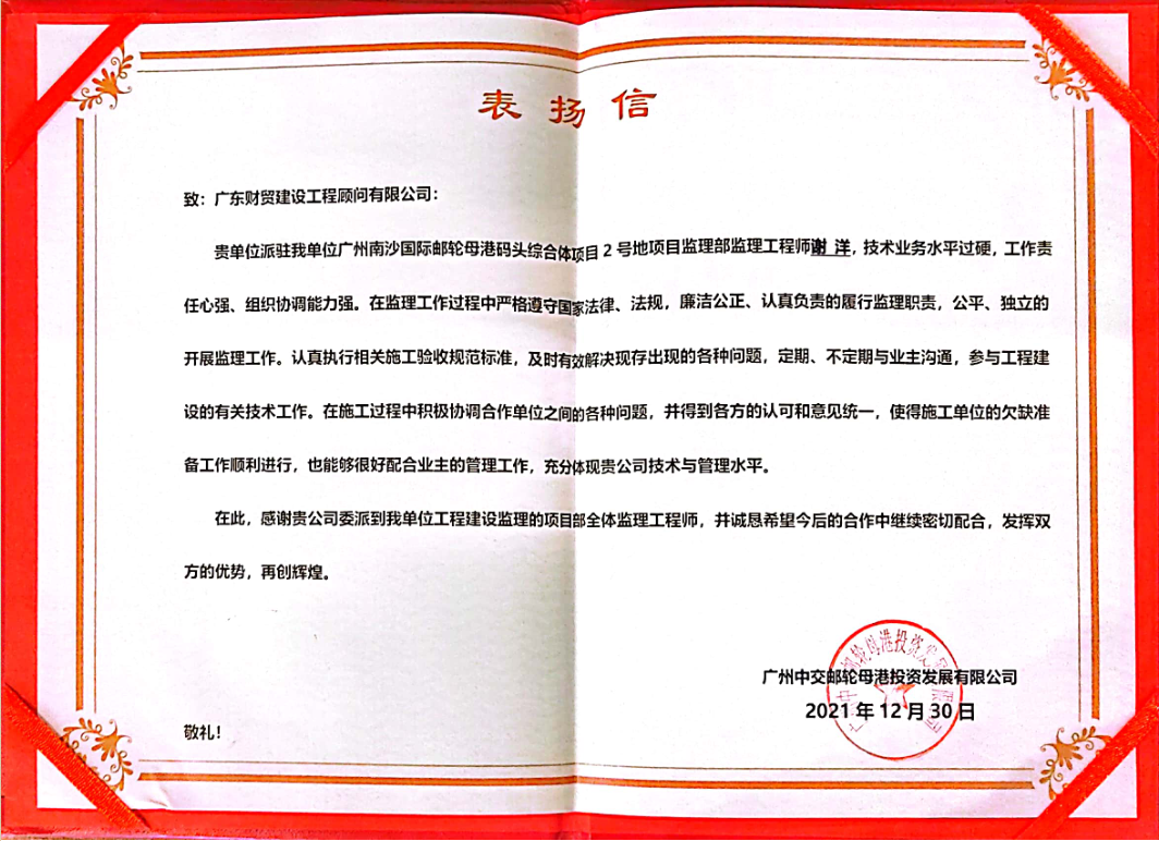 近日,广东财贸收到来自建设单位——广州中交邮轮母港投资发展有限公司的三封表扬信,建设单位在信中对我司广州南沙国际邮轮母港码头综合体项目2号地项目监理部的三名监理工程师朱进高、黄伟、谢洋同志进行表彰,并对项目部全体监理工程师表示感谢。