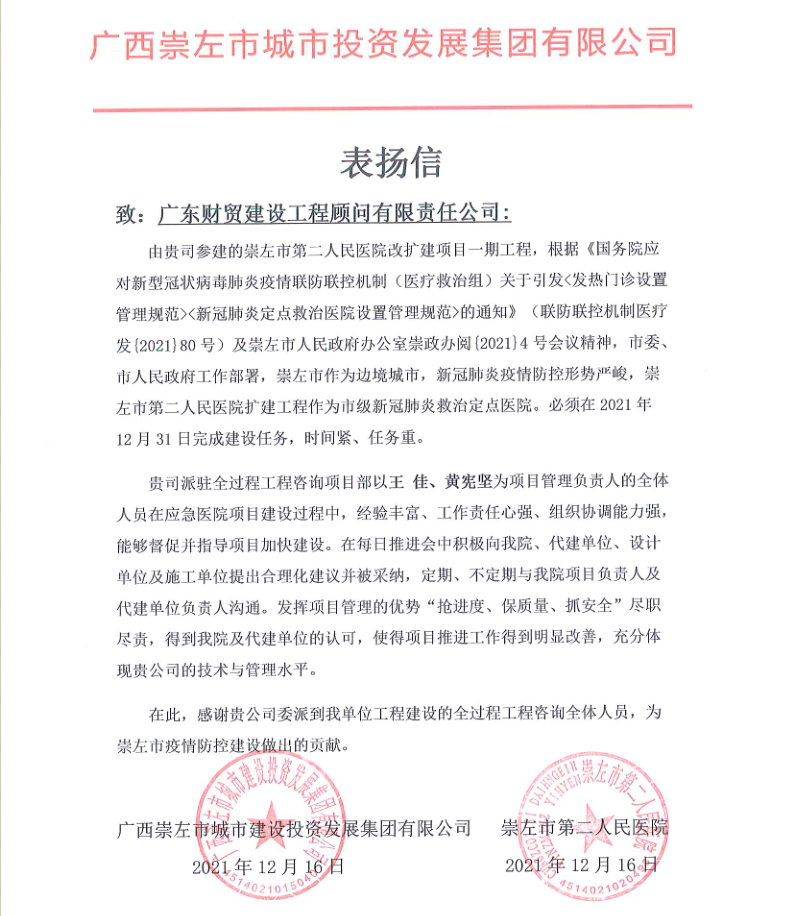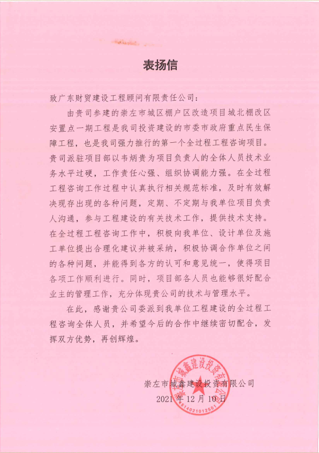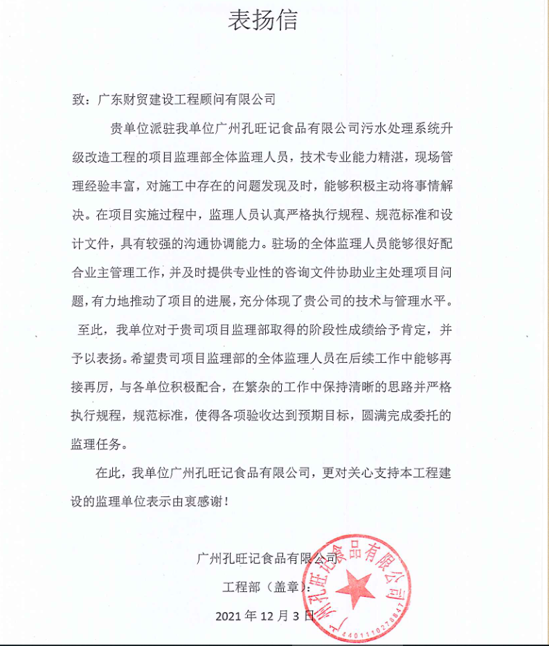 广东财贸从事建设工程顾问领域近三十年,始终坚持把工程质量放在第一位,始终注重培养高质量人才作为中坚力量,因此能受到各方人员的一致肯定。今后,我司作为工程建设全过程服务优质顾问公司,会继续培养优秀人才,坚持技术引领,将业主的肯定当作继续前进的有力鞭策与鼓励。