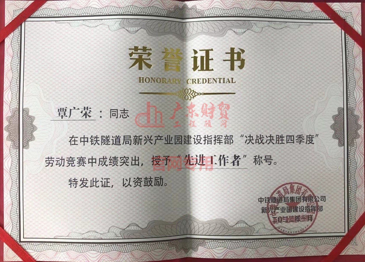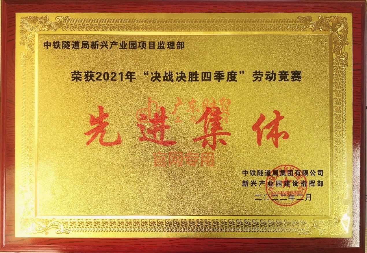 近日,我司在中铁隧道局集团有限公司举办的2021“决战决胜四季度”劳动竞赛中收获喜人成果,我司中铁隧道局新兴产业园项目监理部荣获先进集体,监理工程师覃广荣同志被授予“先进工作者”称号。