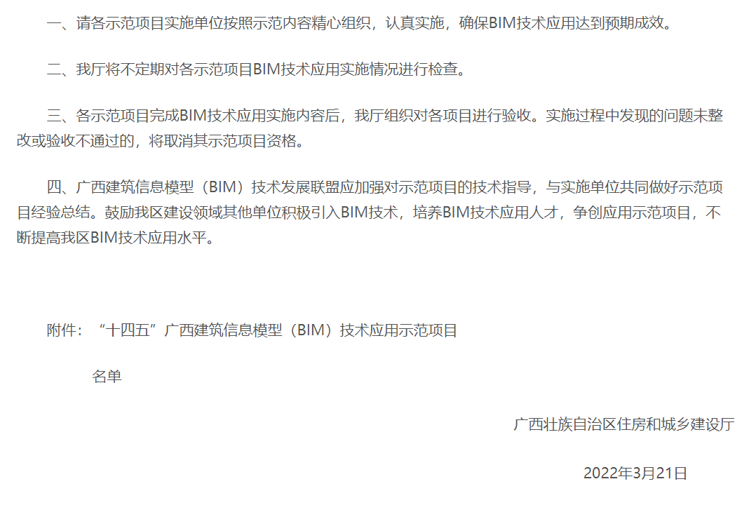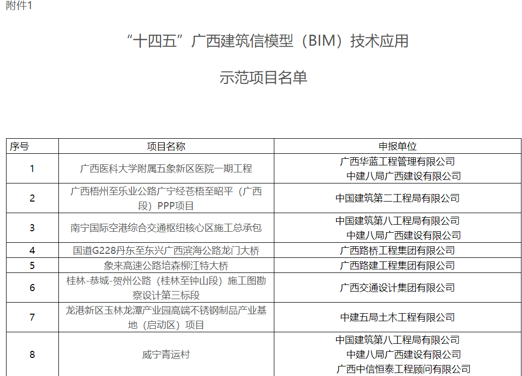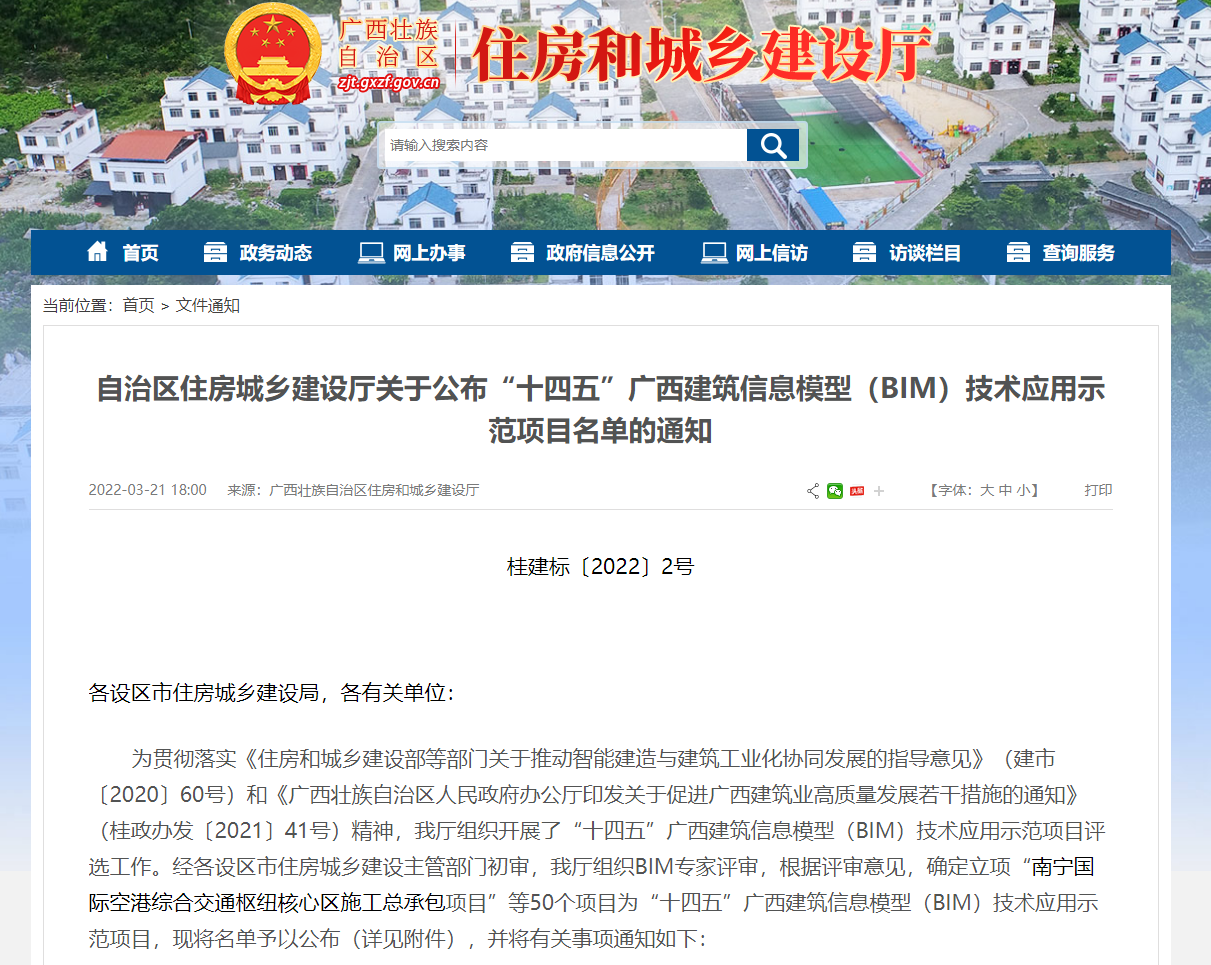 “十四五”广西建筑信息模型(BIM)技术应用示范项目评选工作,是广西壮族自治区住房和城乡建设厅为贯彻落实《住房和城乡建设部等部门关于推动智能建造与建筑工业化协同发展的指导意见》和《广西壮族自治区人民政府办公厅印发关于促进广西建筑业高质量发展若干措施的通知》文件精神,鼓励建设领域各单位积极引入BIM技术,培养BIM技术应用人才而开展。经各设区市住房城乡建设主管部门初审及组织BIM专家评审,我司承接的广西儿童医疗中心项目最终名列入选的50个BIM技术应用示范项目之中。