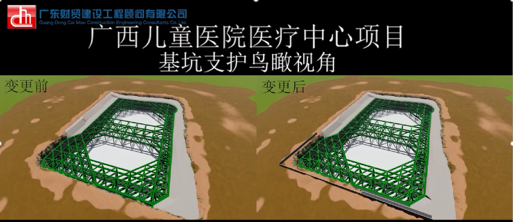 在该项目中,我司为业主提供全过程工程咨询服务,其中BIM咨询的服务内容主要包含以下几点:1、对医院连廊方案比选进行可视化模拟;2、对基坑支护变更进行可视化模拟及工程量比对;3、对总承包单位BIM应用进行监督管理:包括要求总承包单位提交BIM应用策划方案,按节点提交BIM成果,对地下室施工复杂节点进行施工工艺模拟,审核总包单位提交的地下室模型提出修改意见并跟进修改情况,对管线综合成果提出具体要求等。在我司BIM团队及各方人员的努力下,项目高质量有序推进。