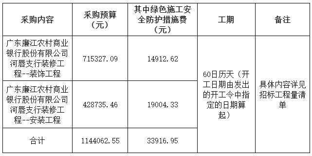 二、采购项目名称:广东廉江农村商业银行股份有限公司河唇支行装修工程