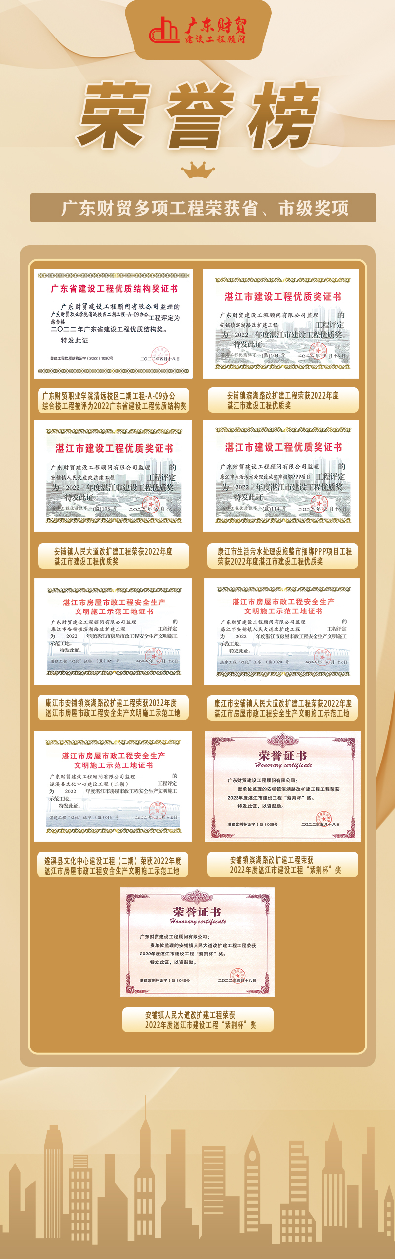 此次多个项目获得荣誉,是行业对我司的肯定。广东财贸作为工程建设全过程服务优质顾问企业,始终以高质量技术为核心,坚持严谨高效的项目管理,为客户提供优质服务,致力打造精品工程。