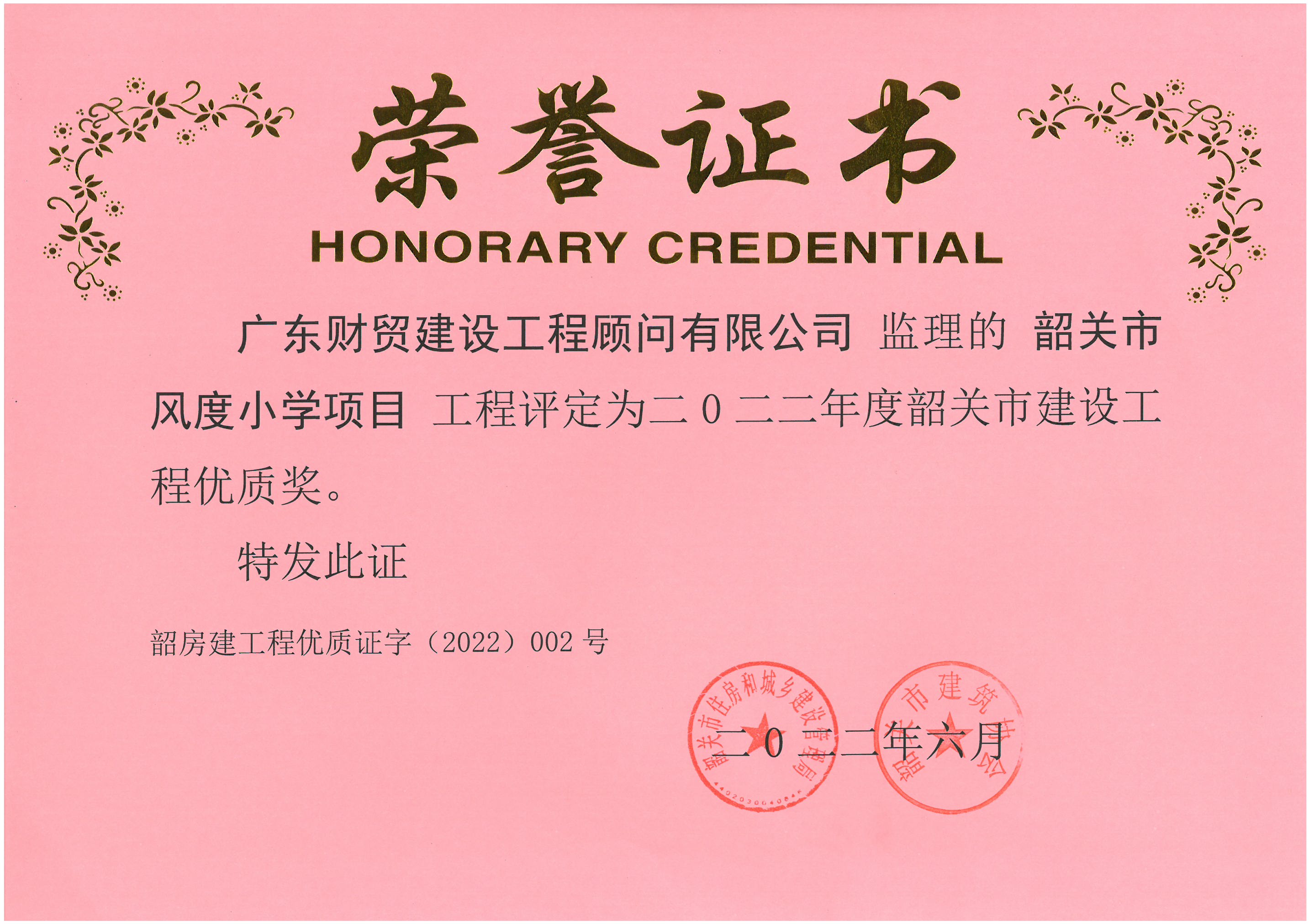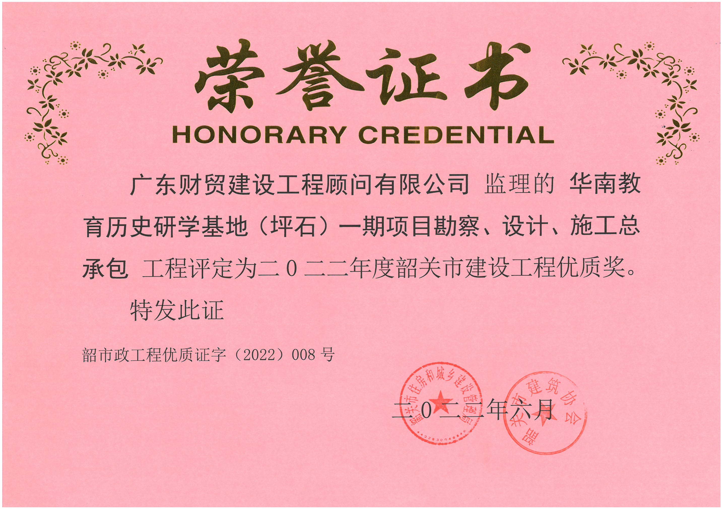 凯歌阵阵,喜报频频。近期,广东财贸监理的华南教育历史研学基地(坪石)一期项目勘察、设计、施工总承包工程评定为2022年度韶关市建设工程优质奖;广东财贸监理的韶关市风度小学项目评定为2022年度韶关市建设工程优质奖。