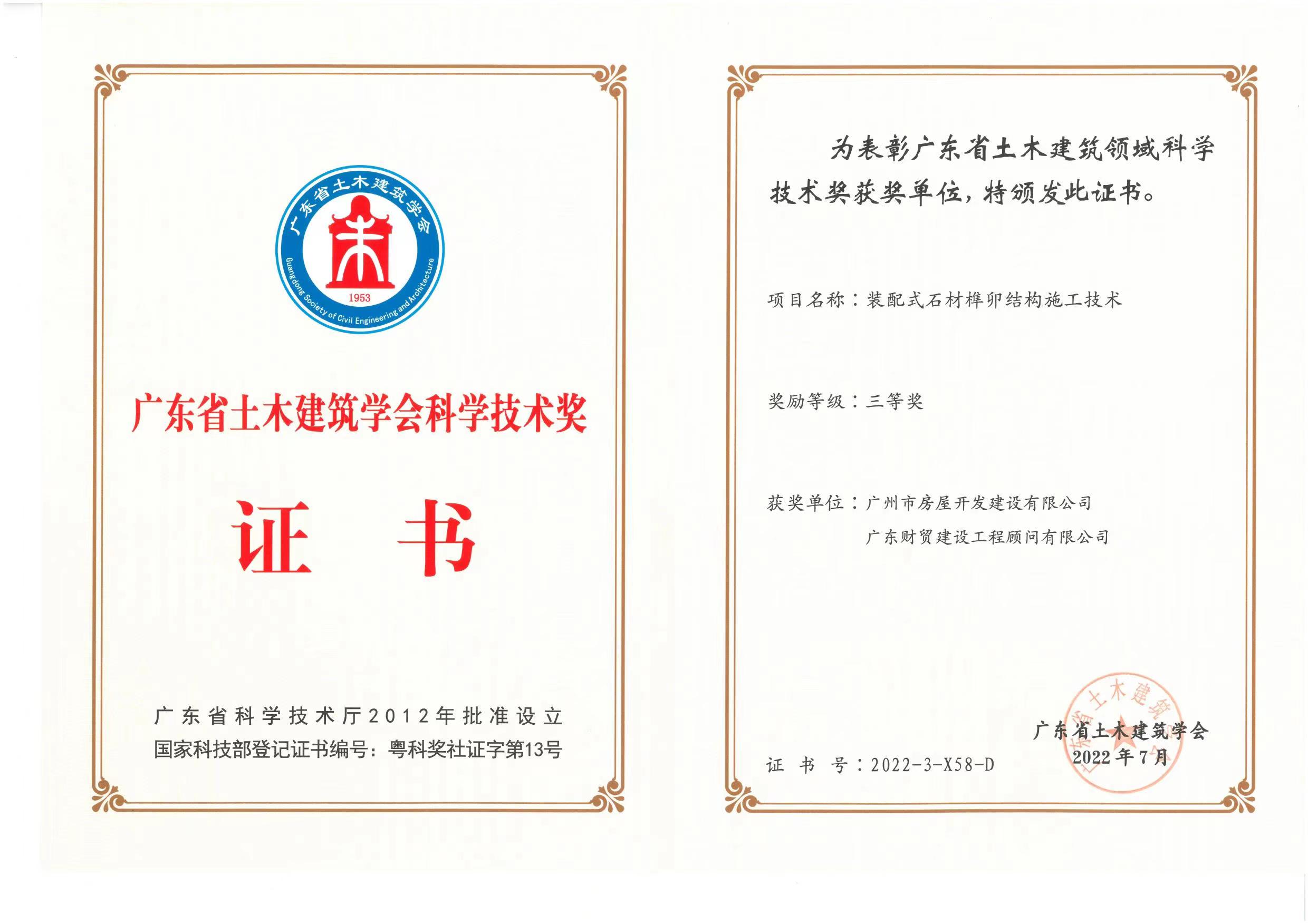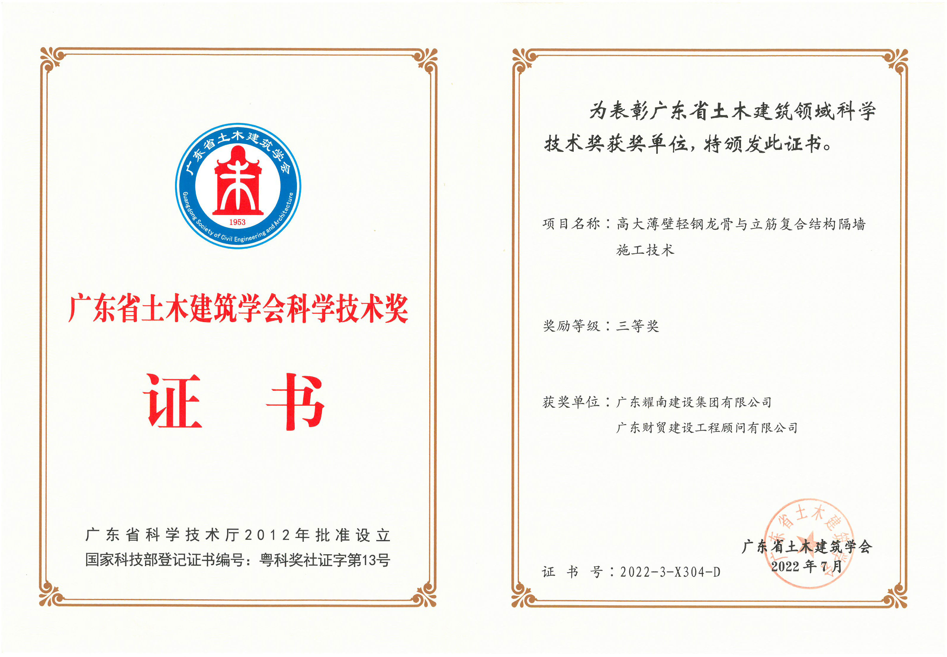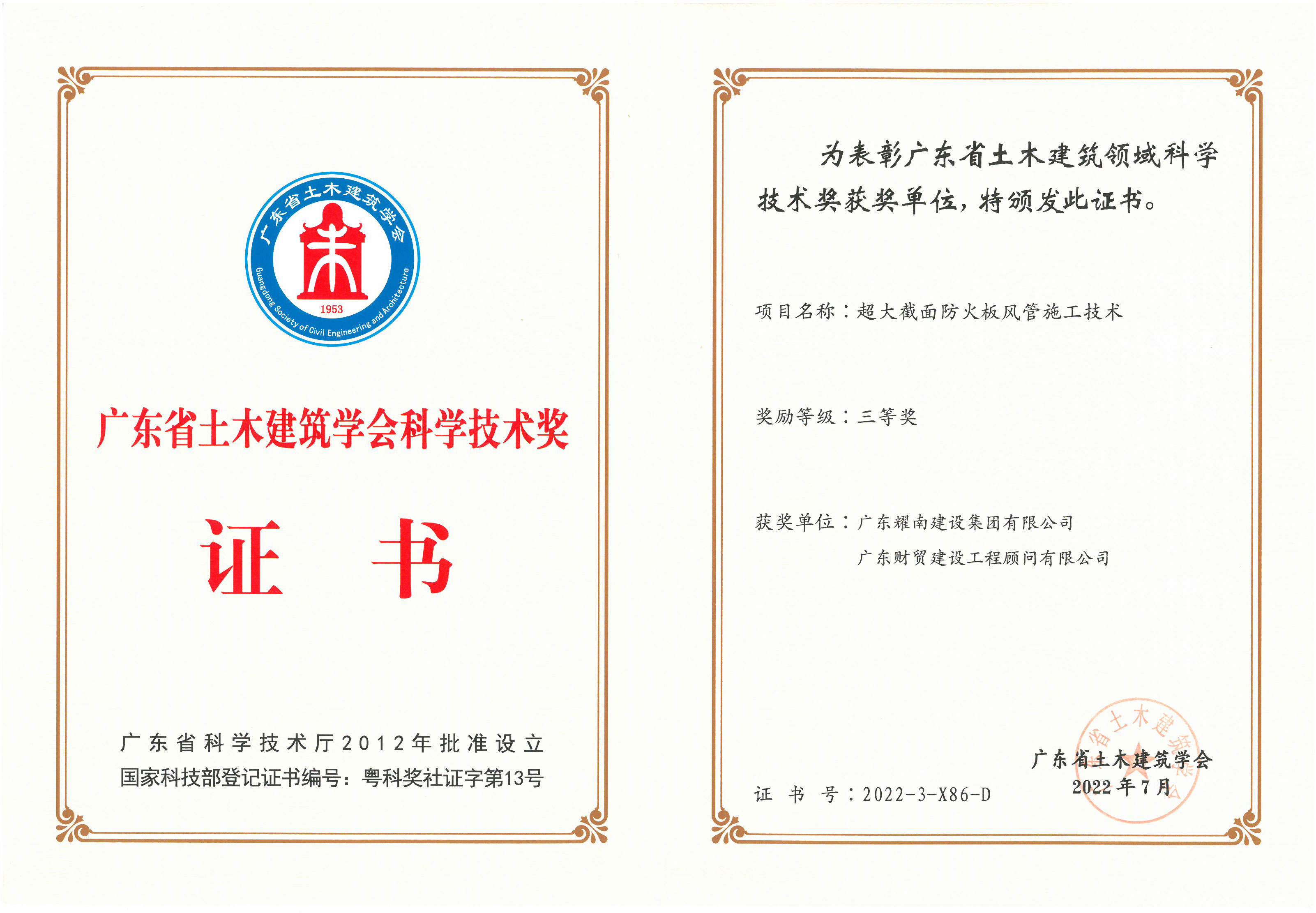 近日,广东省土木建筑学会公布了第十届广东省土木建筑学会科学技术奖获奖项目名单,经评审委员会评审及奖励委员会审定,我司三项技术成果荣获三等奖,分别是高大薄壁轻钢龙骨与立筋复合结构隔墙施工技术、超大截面防火板风管施工技术和装配式石材榫卯结构施工技术。