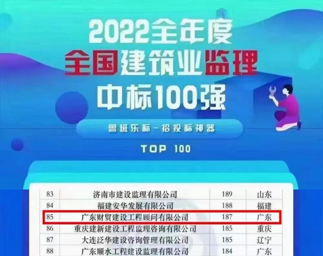 近日,广东财贸建设工程顾问有限公司以中标187项的成绩荣登“2022年度全国建筑业监理中标100强”榜单!