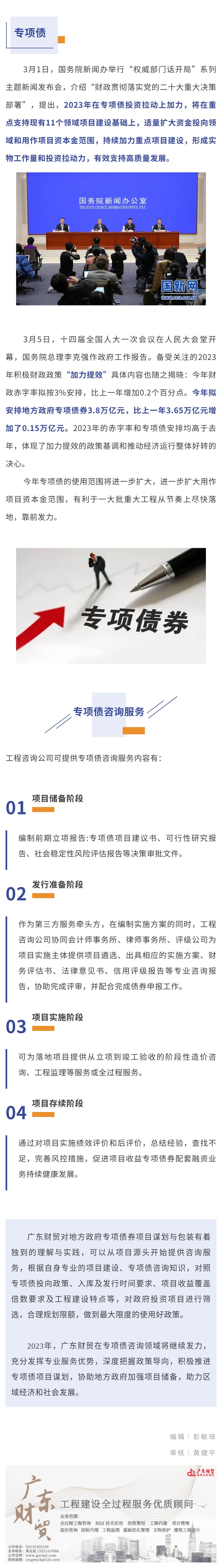 【概要描述】广东财贸对地方政府专项债券项目谋划与包装有着独到的理解与实践,2023年,将在专项债咨询领域将继续发力,充分发挥专业服务优势,深度把握政策导向,积极推进专项债项目谋划。