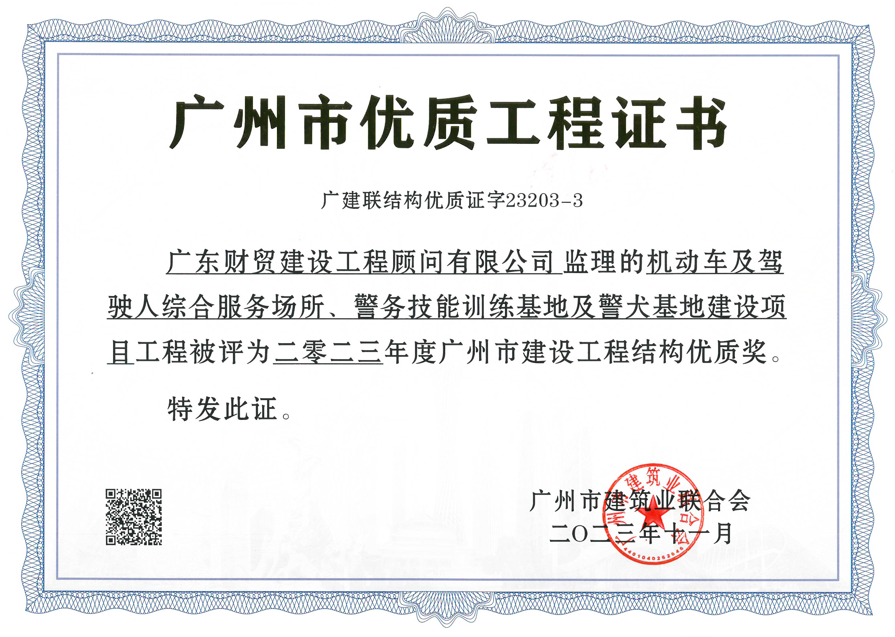 2、机动车及驾驶人综合服务场所、警务技能训练基地及警犬基地建设项目工程荣获2023年度广州市建设工程结构优质奖。