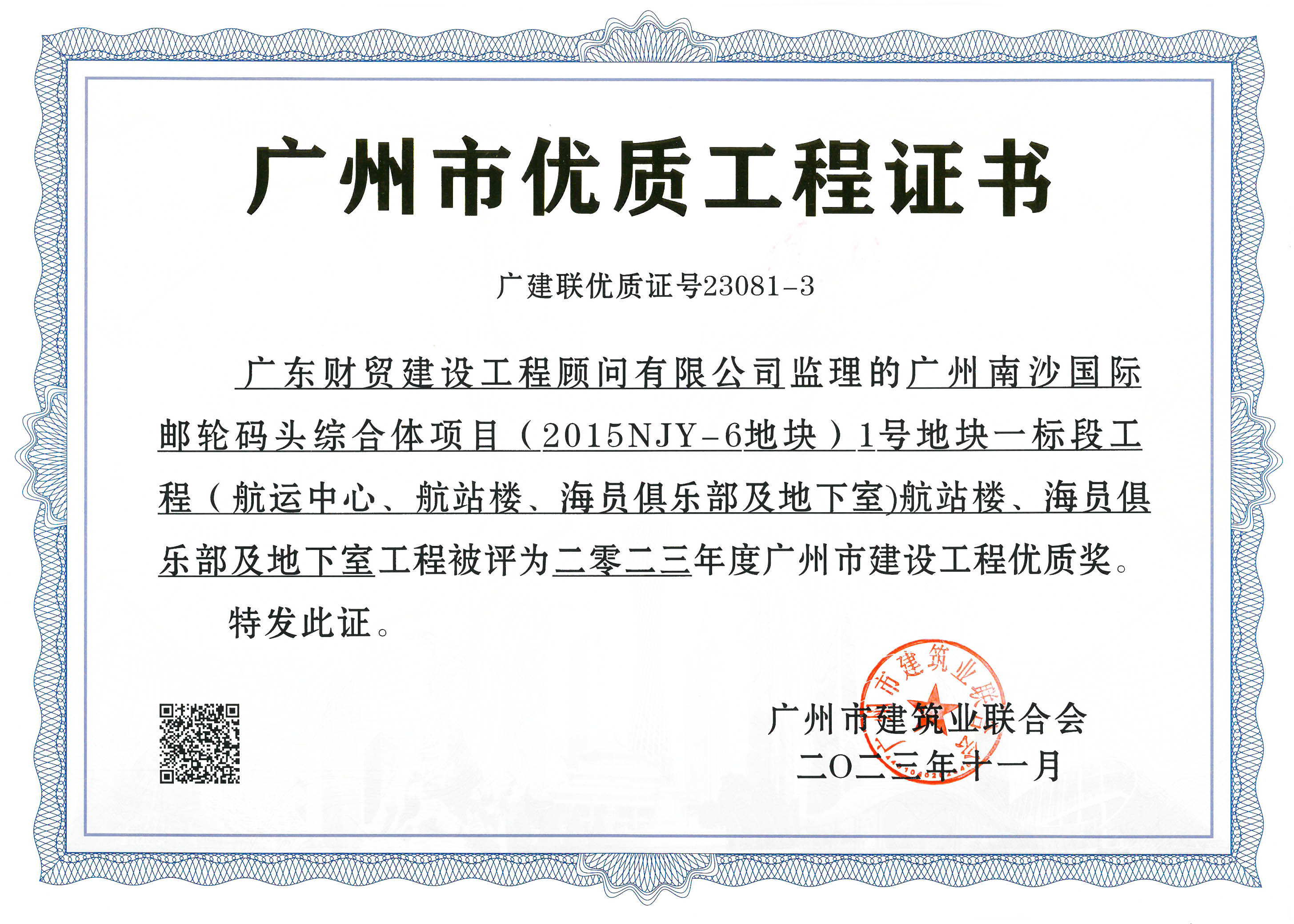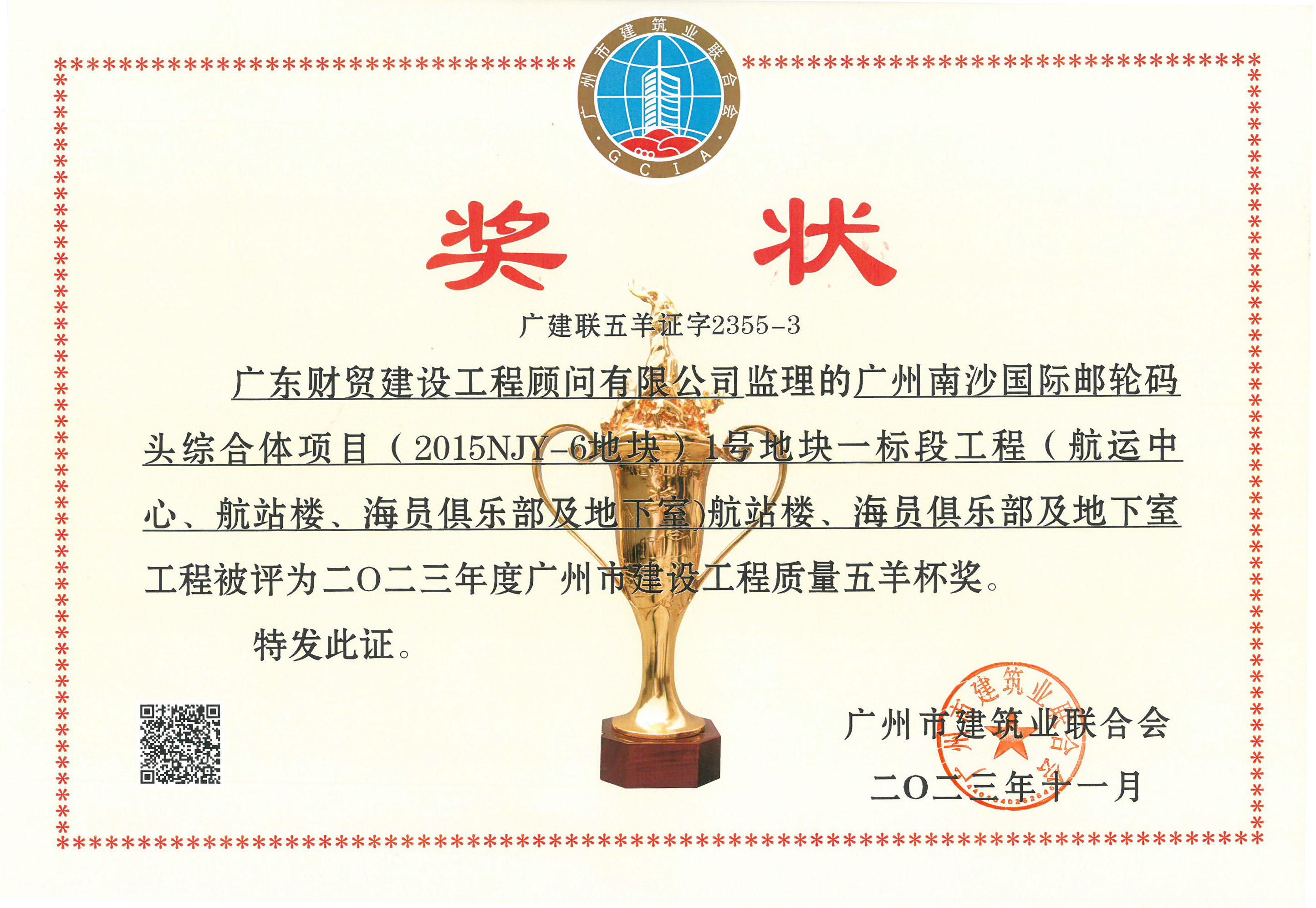 1 、广州南沙国际邮轮码头综合体项目(2015NJY-6地块)1号地块一标段工程(航运中心、航站楼、海员俱乐部及地下室)荣获2023年度广州市建设工程质量五羊杯奖和2023年度广州市建设工程优质奖。