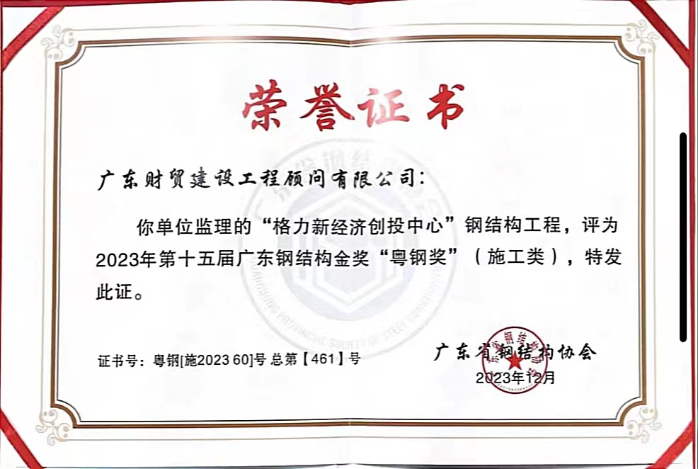3、格力新经济创投中心项目荣获2023年第十五届广东钢结构金奖“粤钢奖”。