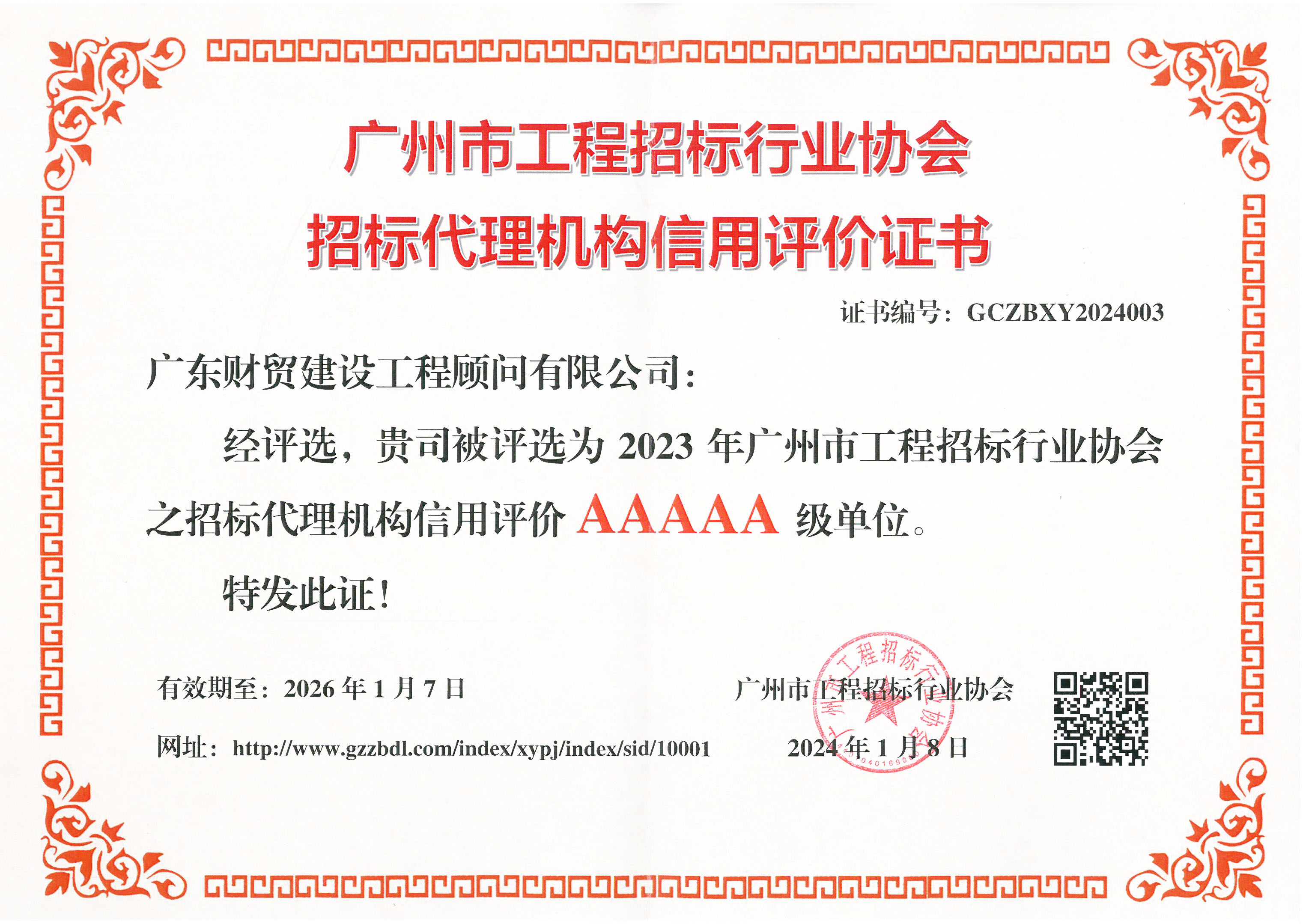 近日,广东财贸建设工程顾问有限公司获评“2023年广州市招标行业协会之招标代理机构信用评价AAAAA级单位”。