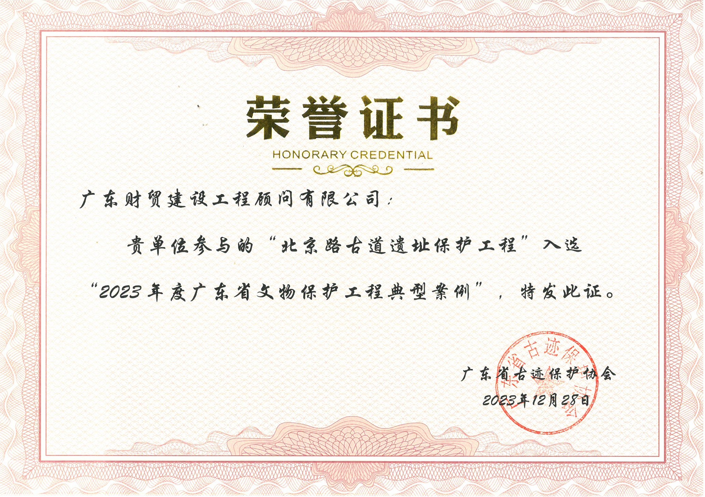 在党的十九大战略部署和《中共中央国务院关于完善促进消费体制机制进一步激发居民消费潜力的若干意见》精神和商务部印发的《推动步行街改造提升工作方案》指引下,越秀区建设和水务局以总承包方式对北京路步行街千年古道进行展陈提升。广东财贸建设工程顾问有限公司作为该项目的监理单位,荣获由广东省古迹保护协会颁发的2023年度广东省文物保护工程典型案例的荣誉。该奖项的获得,不仅代表着对我司专业技能和服务态度的认证,也是对我司在文物保护和旧城改造方面成就的肯定。